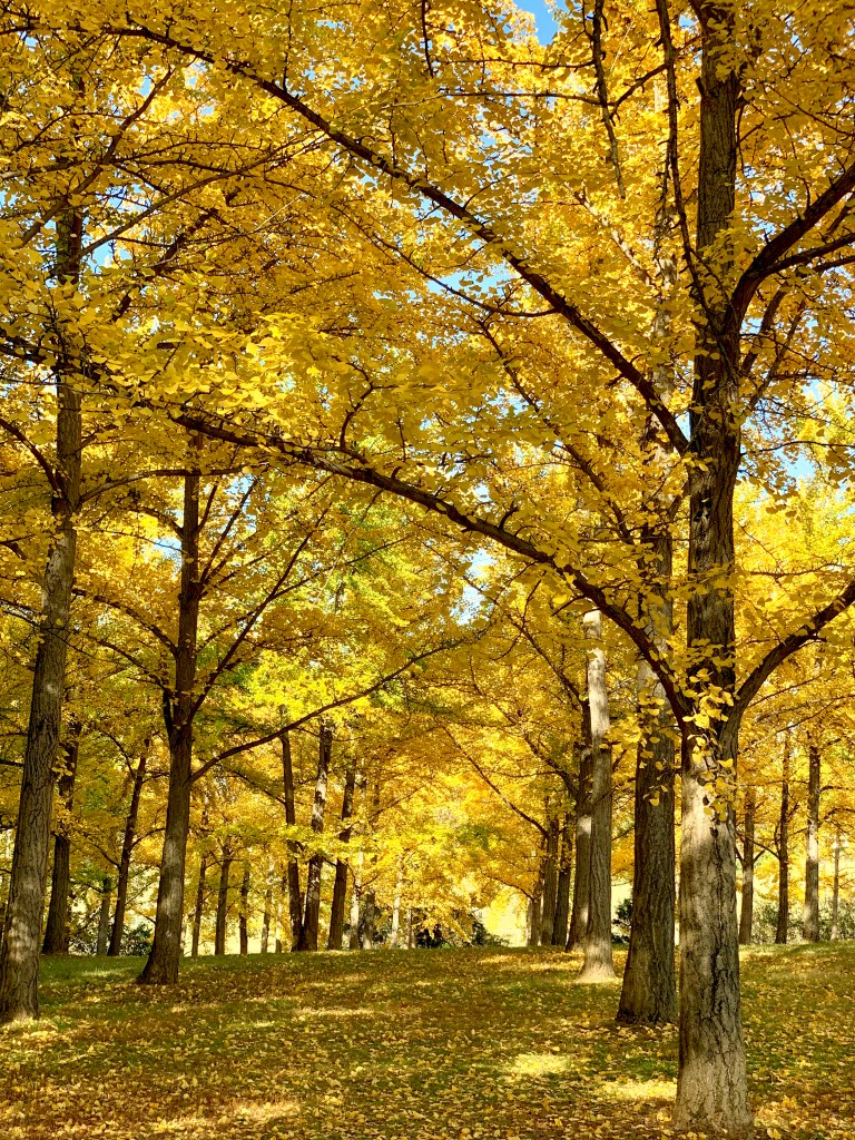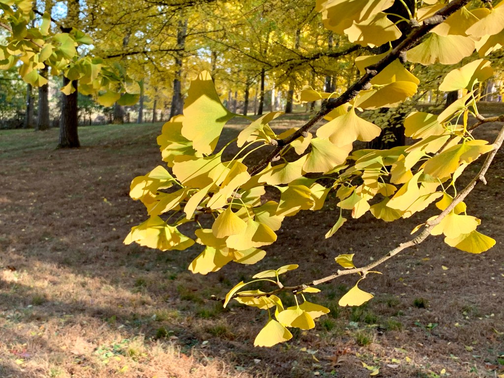 As I was leaving, a Facebook friend shared photos of brilliant yellow ginkgo trees in Boyce. They were at peak. I wanted to wonder through that grove too! With enough will, I found a way. WAZE listed our ETA at 3:15 PM! The facility is open until dusk. If not now, when? Rain is expected for the next few days and the beautiful leaves will wither and fall.