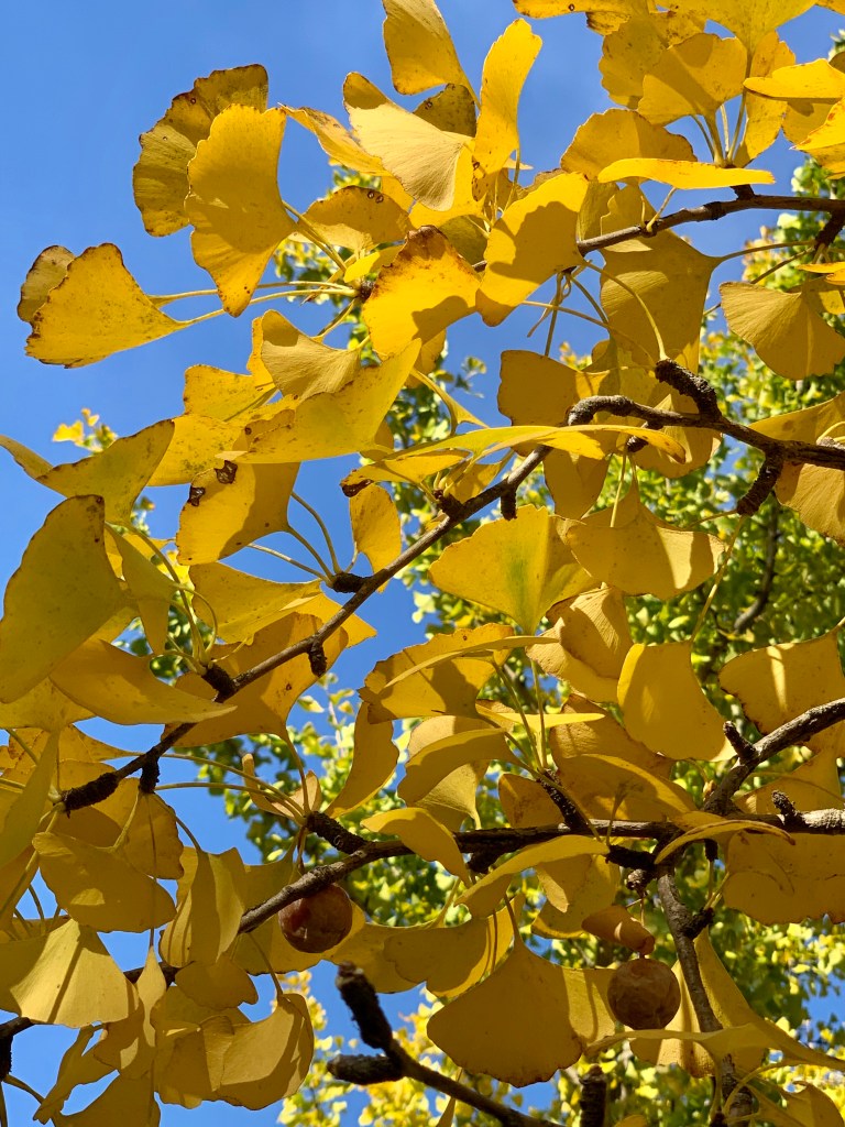 Turning on to Blandy Farm Lane, I felt that something magical was about to happen. There was peace. . The western sun illuminated the landscape brilliantly. Arrows pointed to “Ginkgo Grove.” As I approached, the grove of golden ginkgos greeted us a “with open arms.” Ginkgo leaves quaked on every branch. Never have I seen such a profusion of color or that many ginkgo trees. From the website, I learned that there are 300 trees in the grove.