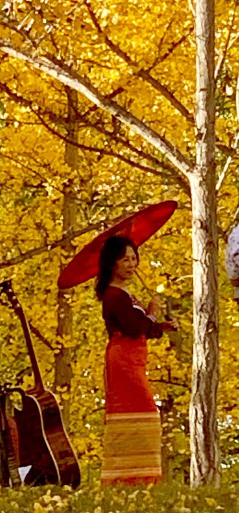 A photo shoot was in progress atop a knoll in the grove. Red parasols punctuated the golden backdrop. Beautiful Asian women in lovely long skirts posed, some with guitars. It was hard to not gawk. However, my curiosity drove me to move on and explore more.
