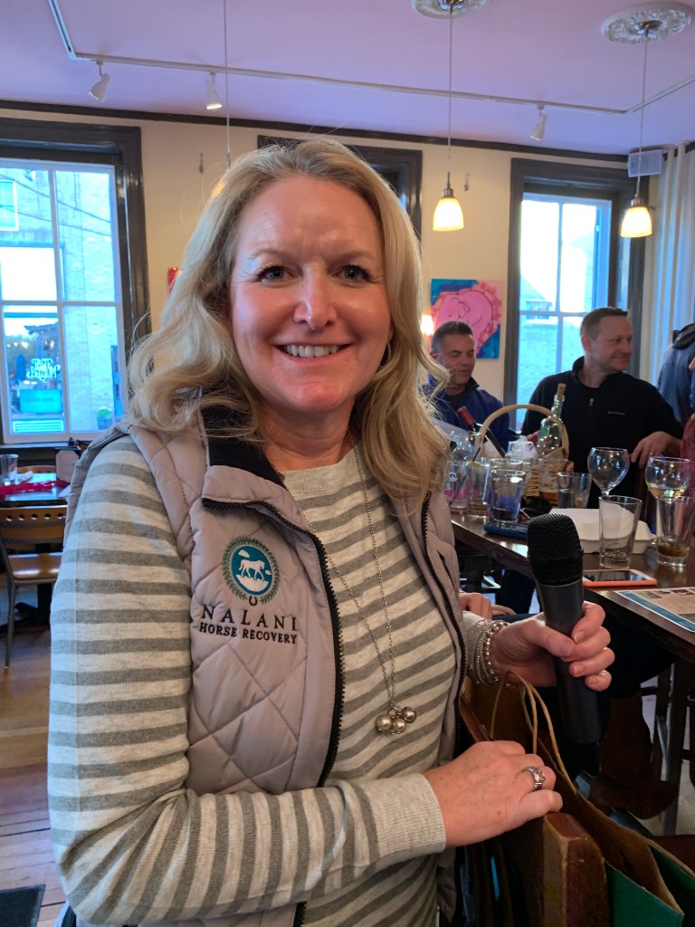 Nalani Horse Rescue, is a non-profit organization, whose mission is to provide horses in need of rescue and care with rehabilitation and training with the goal of finding them safe forever homes. In her short presentation, Cherry explained that one horse can cost up to $10,000 per year to rehabilitate and manage until the right rehoming opportunity arises. There are four horses at Nalani now. The most recent rescue, “Devil in the Shadows,” now called, Belle, a 6-year-old thoroughbred, was a race track discard headed to slaughter. With just enough funds raised, Belle came to Nalani. Now, she is in good flesh and in professional training to go to her next career as a purposeful riding horse for the lucky person.