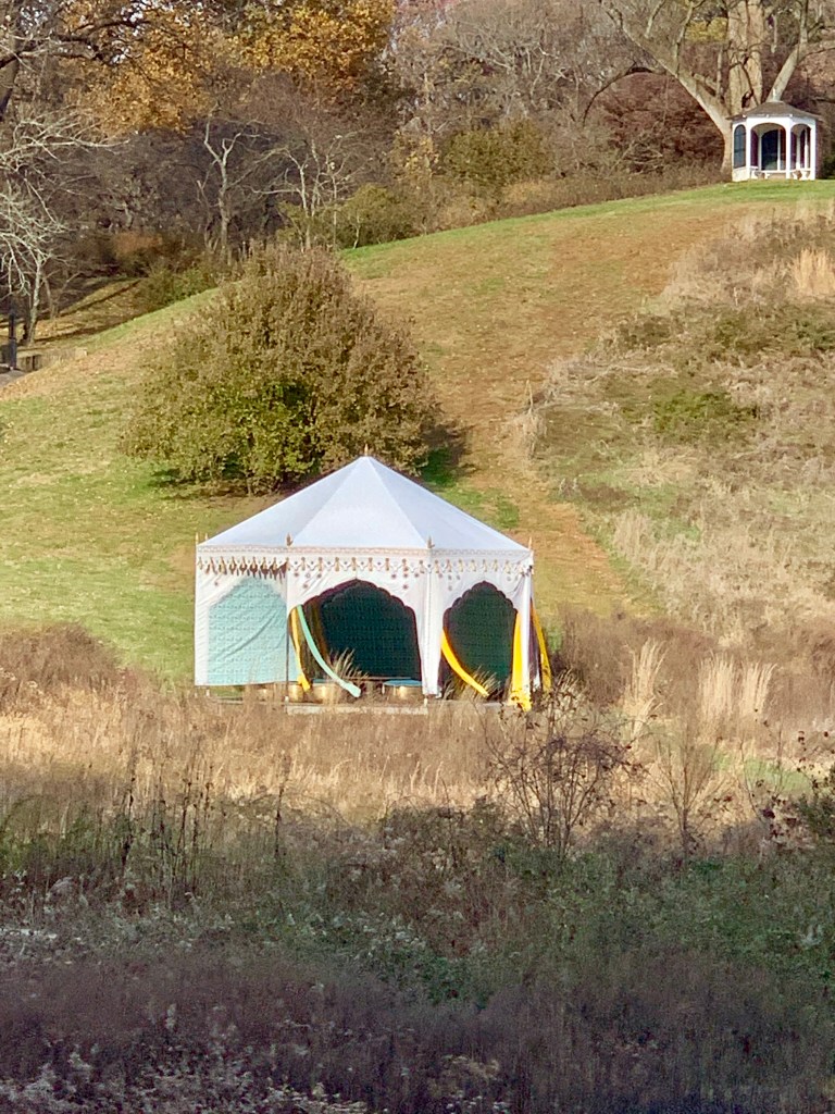 In addition to out arboreal and landscape discussion, we were treated to a conversation about the Follies that dotted the landscape. Follies, we learned, are architectural constructions intended to amuse, delight, and pique one’s curiosity. The Follies Exhibition presents 13 follies. The follies that we passed ranged from the simply charming to the darkly gothic to the reflective and the floating. The garden whimsies were set among the landscape, and true to their intent, captured interest and curiosity. The Chinese Pavilion folly at the entrance of the house greeted us. It’s green structure and garden themed design made a lovely transition from the natural beauty we just experienced to our anticipated adventures.