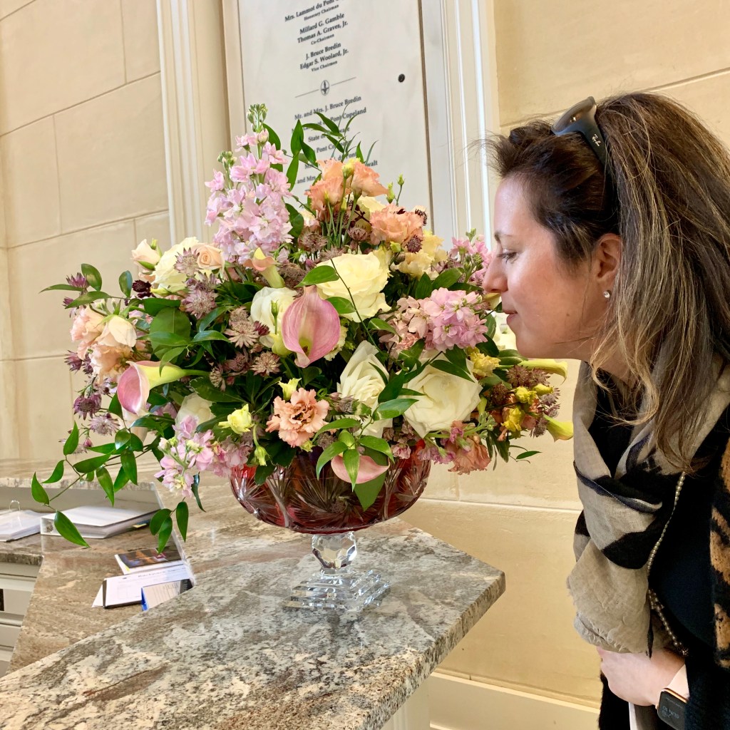 There was a beautiful bouquet of fresh flowers at the check-in desk. Having just heard about “pastel watercolor shades,” the bouquet brought forth a metal image of the azalea grove in springtime. Tiffany enjoyed its fragrant, delicate flowers of cream colored roses, lilac and pink snapdragons, rose calla lilies, and nectar-colored flowers that we could not name.