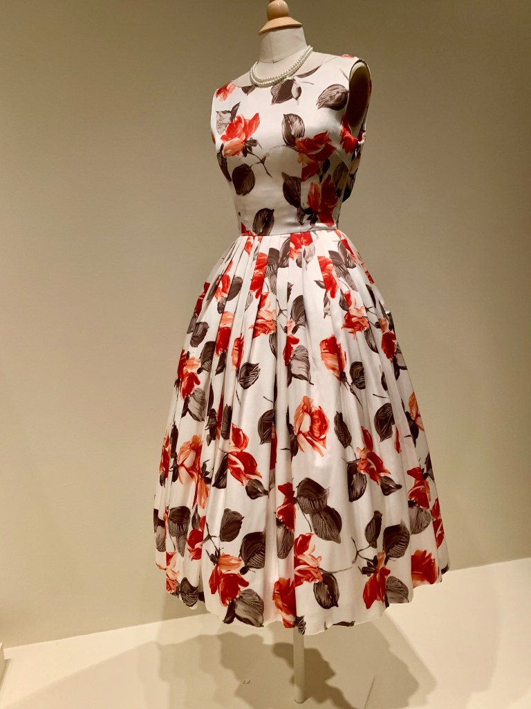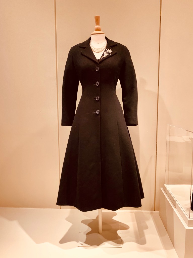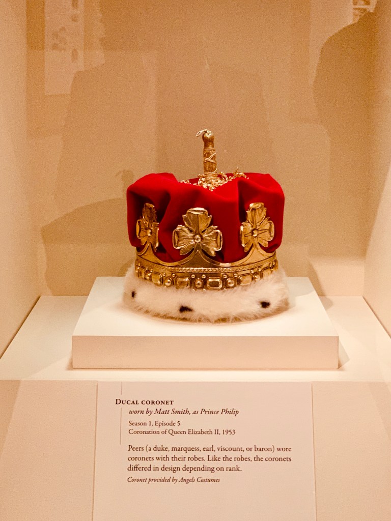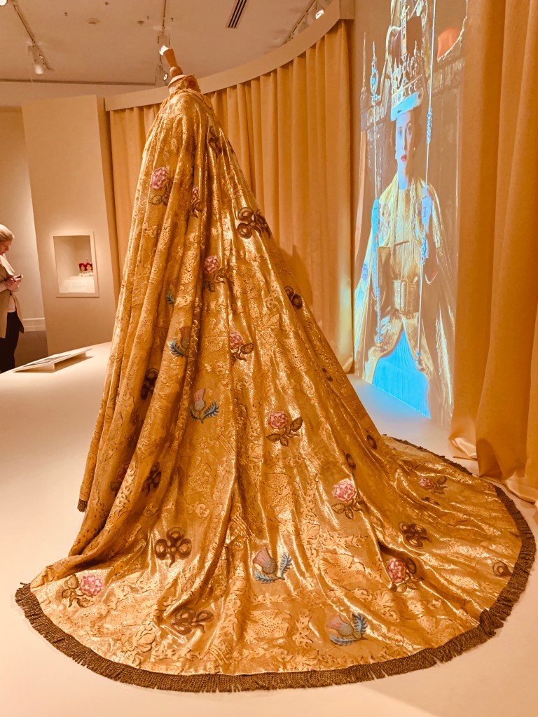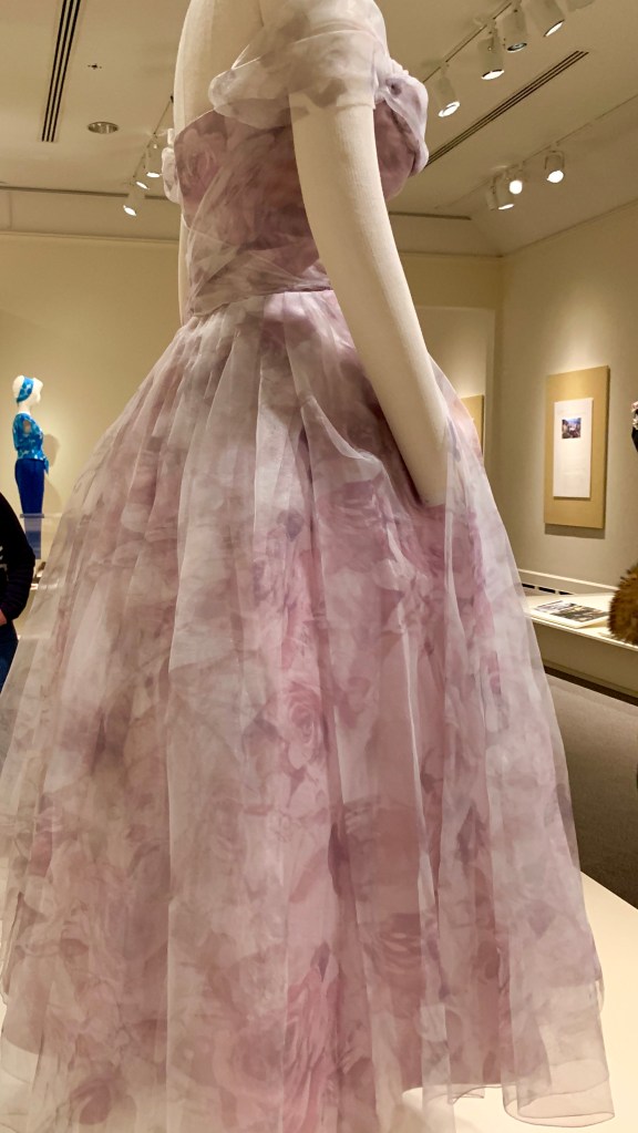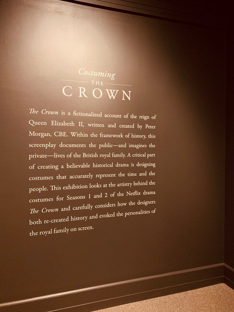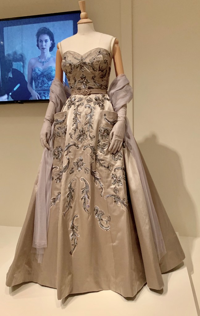 At the top of the stairs, was the grand exhibit, “Costuming the Crown.” It was a visual celebration of light, color, texture, design and inspiration. A vast collection of 40 costumes from the first two seasons of the Netflix series, The Crown, beckoned. The exhibit showcases and describes the costume similarities and differences of the original garments and their adaptation for the modern audience, the physical attributes of the actors, and their movement on set. The designers’ reflections on their creative process, commitment to details, explanations of fabric selections, detail adaptations, and design specifics gave us a new appreciation.
