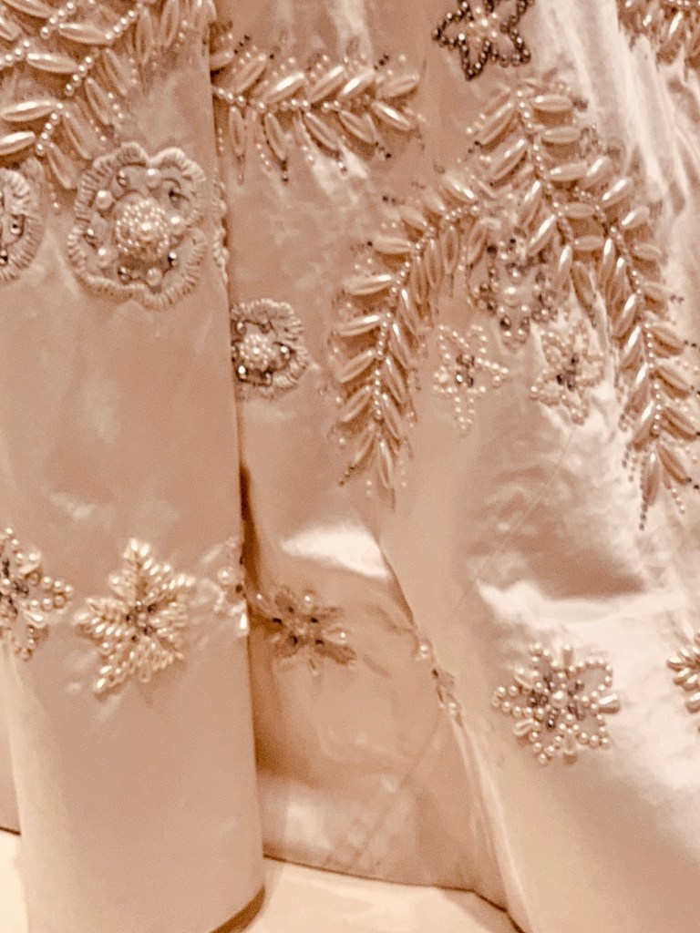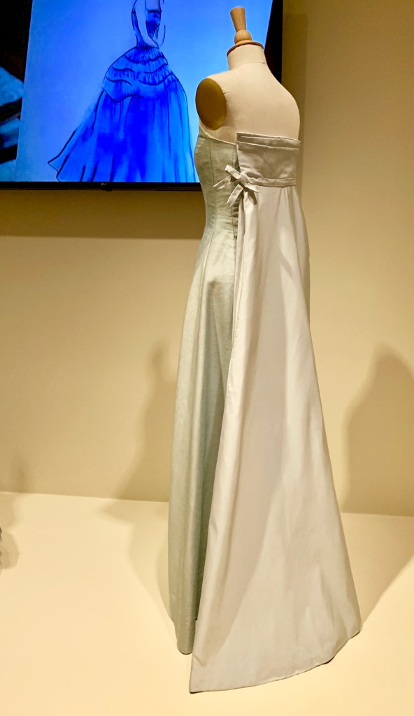 One of my favorite displays was the Kennedy visit. Both the Queen and First Lady wore beautiful gowns in shades of blue for the state dinner. The video playing above that exhibit is an exchange between the Queen and her designer, “ …one must ask oneself what precisely one wants to feel when wearing it.” The Queen (Claire Foy) replies, “I just think that one doesn’t want to feel . . .second best.” ”Quite.” Replies the designer who continues, “Especially when one is very much the senior of the two individuals. . . In terms of rank, ma’am. To that end, I have something quite specific in mind. … Mrs. Kennedy may have dazzled in Paris, but let’s not forget France is a Republic – This is a monarchy. And if you’ve got it, flaunt it, I say.” The tension between the Queen and Jackie Kennedy is well documented.