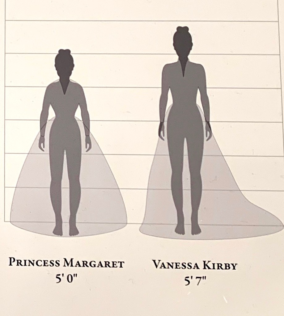 The wedding gowns worn by the Queen and her sister, Princess Margaret, were created as closely as possible to the actual garments. However, the actresses portraying the Queen and Princess presented physical challenges in maintaining the scale of the gowns. Margaret was five feet tall. Vanessa Kirby, who plays her is 5’7”. The dress had to be re-proportioned so that it would look right on the actress. Accomplishing this required additional and various weights of fabric to develop the look and movement of the gown. The Queen’s gown proportions required reworking the sleeves to fit actress, Claire Foy.