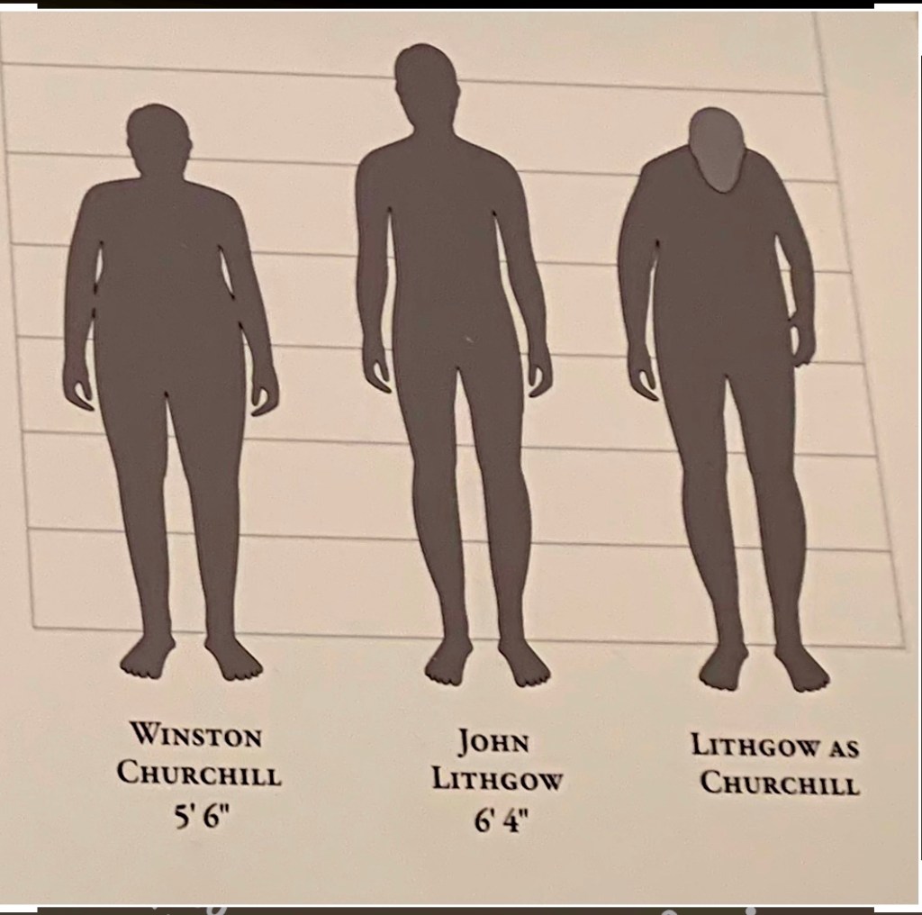 John Lithgow who played Sir Winston Churchill is 6’4”. Churchill was 5’6” tall. Lithgow’s scale and proportion challenges were overcome with construction of an undergarment that added bulk to the body and adapted posture – some “behind the scenes” bits demonstrated the designers’ and creators’ humor.