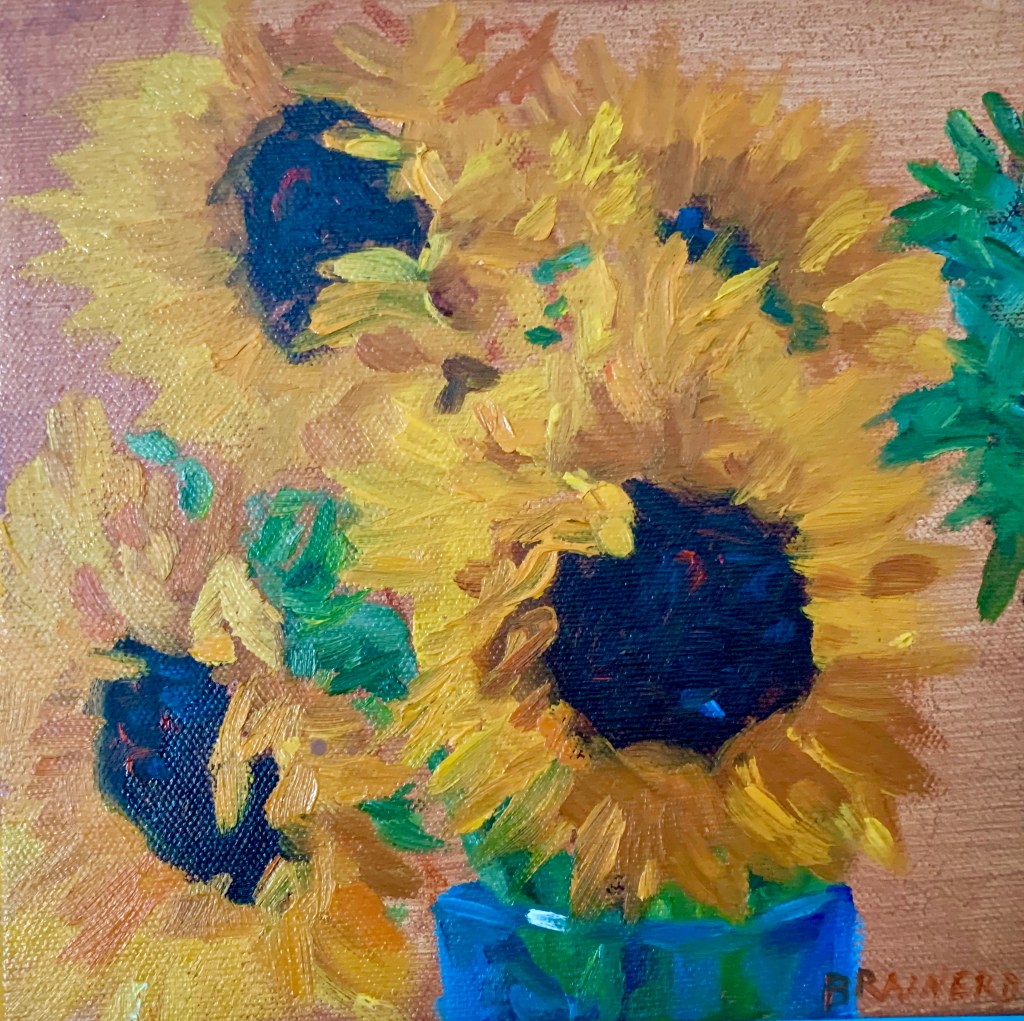 My first piece was Lavender in a Blue Vase with Copper Turkish Coffee Pot. Why? Well, the coffee pot’s gleaming copper side drew me in and brought back warm childhood memories of a copper pot on my grandmother’s stove. The Utah Road road takes me to a place of trail ride memories with my beloved horse, Daisy. Sunflowers and tulips? Flowers evoke feelings of joy and promise. My latest – Wildflower Bounty, captured my heart with memories of bluebells on the trails in Great Falls, Virginia, and the vast light and expanse where Daisy and I once rode.