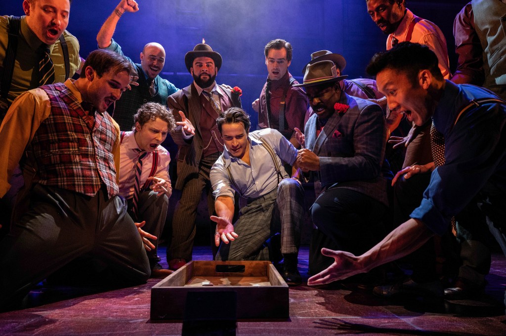 Top left – bottom: The cast of Guys and Dolls at Shakespeare Theatre Company. Photo by Teresa Castracane Photography. Lawrence Redmond, John Syger, Julie Benko, Jimena Flores Sanchez, and Katherine Riddle in Guys and Dolls at Shakespeare Theatre Company. Photo by Teresa Castracane Photography. Calvin McCullough and Kyle Taylor Parker in Guys and Dolls at Shakespeare Theatre Company. Photo by Teresa Castracane Photography. The cast of Guys and Dolls at Shakespeare Theatre Company. Photo by Teresa Castracane Photography.