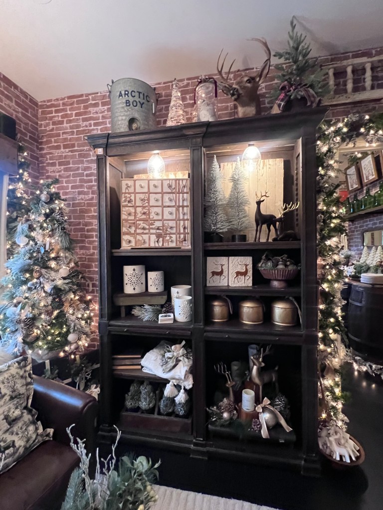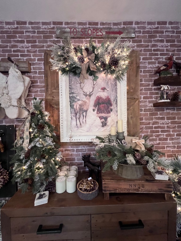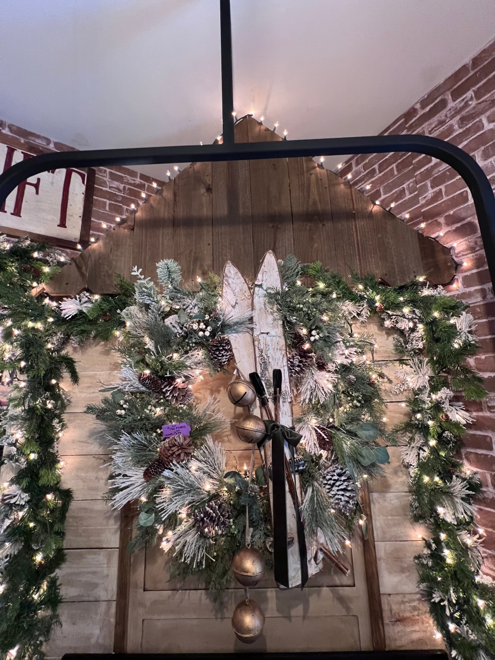 Kim has once again transformed her furniture and gift boutique into winter’s magicland. This year the magic unfolds at an “Alpine Lodge.” Skis and snowshoes lean casually near a bay window where snow swirls outside. A tall tree glimmers nearby, dressed in emblems and patches from local ski areas—a nod to the season’s adventures and the spirit of home. The theme is subtle and sophisticated, never overwhelming; it speaks to anyone who appreciates creative craftsmanship, beauty, and warmth, whether they have ever set foot on a ski slope.