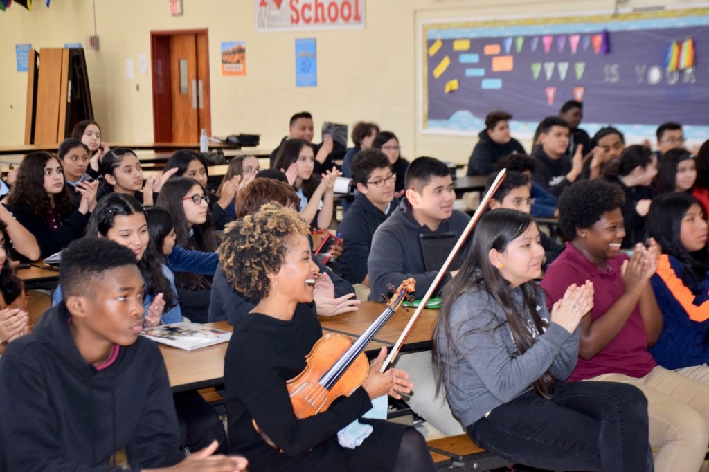 Melissa White with students at Nicholas Orem Middle School Photos courtesy of National Philharmonic