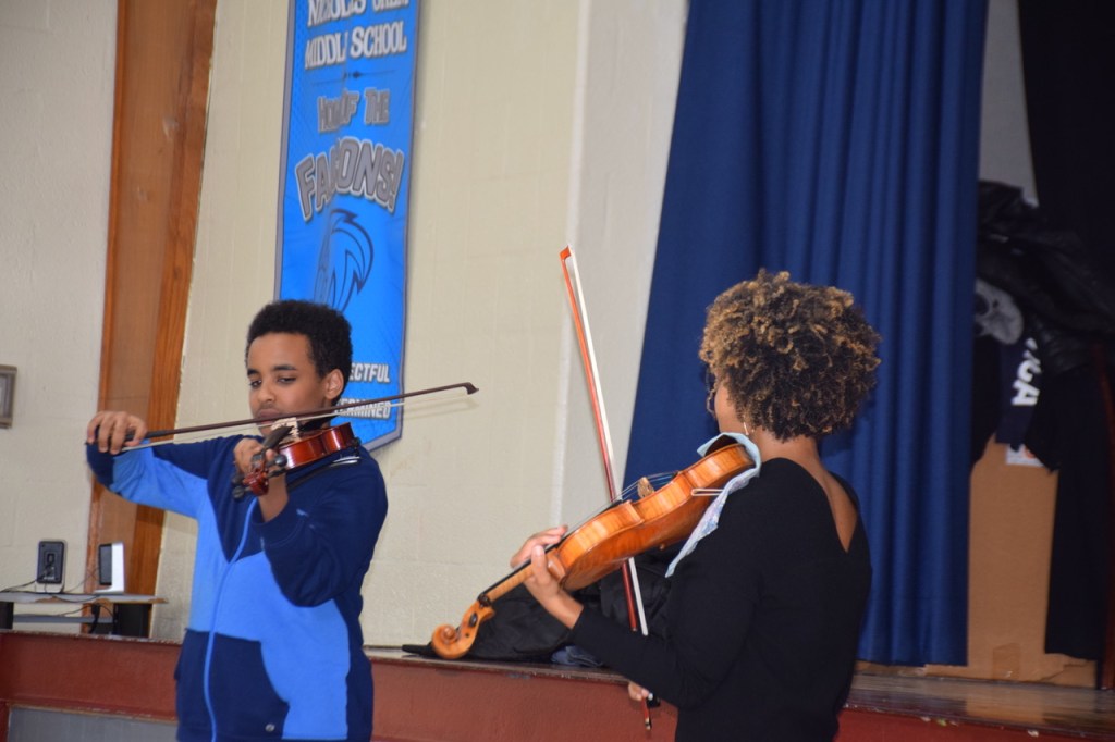 Melissa gave a brief performance and insights on the Florence Price Violin Concerto No. 1 for the students. She also played several selections from Bach. The students had a question and answer opportunity. Finally, Melissa incorporated one of her other passions – the combination of music, movement and mindfulness as she lead the students through activities addressing posture and other relevant instrumental lessons. The demonstration of Intermission Sessions combines, Yoga, meditation, vegan meals, musical practice and other techniques.