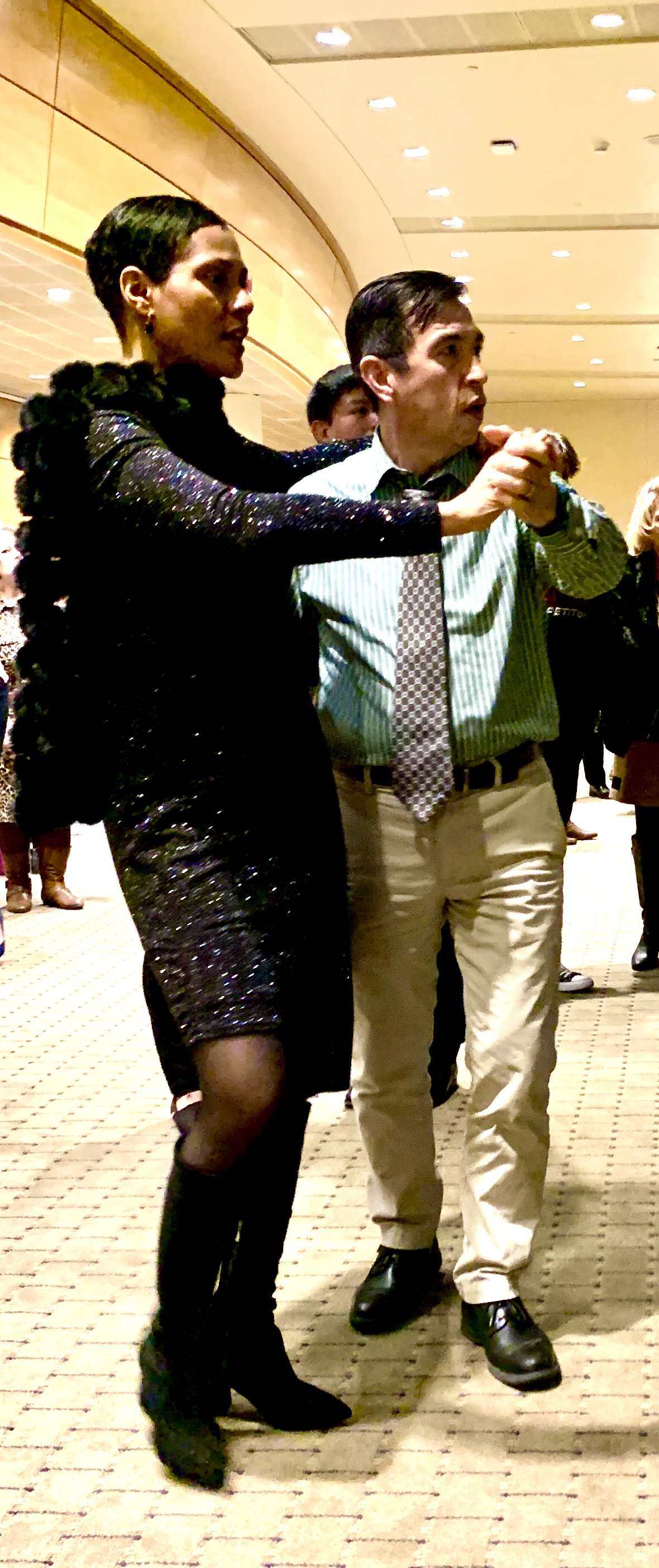 Cliff Collins and Andi Cullins, and Drs. Defoe and Jimenz study the steps and movements of the dance.