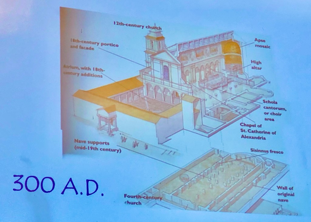 Thousands of people visit the Coliseum daily, the San Clemente Basilica, the first of the three important structures, is just beyond it but gets few visitors. It holds the doorway and stairs to nearly 2000 years of Roman history. You can find yourself standing and walking on the original Romans streets of 100 AD. The present basilica is from the 1100’s and not that old relative to the Roman timeline. There are beautiful mosaics and frescoes. Admission is free. The real story and interest comes from the Normans who invaded Rome and burned the church. Below the floor of the 1100’s church, the original church dating to 300 AD unearthed. It had been burned and buried. “Today, you can visit this, one of the oldest churches in Rome for about 2 Euro, go down 2 flights of stairs and go back in time 800 years. Suddenly the church from the year 300 AD appears. It is dark, dank, and creepy – the tomb of Saint Cyril is just beyond a side door,“ John told the spellbound audience. “Then there is another set of stairs to a room dating to 100 AD on the original street in ancient Rome. It is surreal and otherworldly. Get lost in time,” he continued. Time travel from the 21st Century to the 1100’s to 300 AD and then to 100 AD for just 2 Euro!