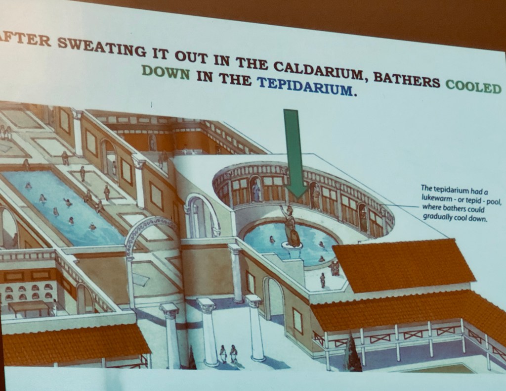The third important place is the Baths of Caracalla. “Remember the Three Tenors performance? They performed there,” John reminded the audience. This was a bath house for the people of Rome to enjoy. “This is the true genius of Roman architecture and building. Their engineering of the water systems, the heating system, the architectural scope, and the breadth and sheer expanse of the structure,” John said. These baths were designed not merely to clean the population. They were designed and equipped with gymnasiums, swimming pools, hot and cold; locker rooms, library, conference rooms, lounging rooms, and other luxuries. They were free to the public of Rome. This area provided physical exercise, intellectual opportunities, and entertainment. The goal was not entirely benevolent. The ruling class knew that happy citizens do not rise up and revolt.