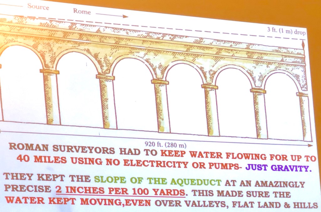 From his energetic and enlightening lecture, there were three take-aways (with much sub texts): The food is great; there are three very special and off-tourist adventures to take in; and water was very important during the Roman Empire and many of the edifices remain today.