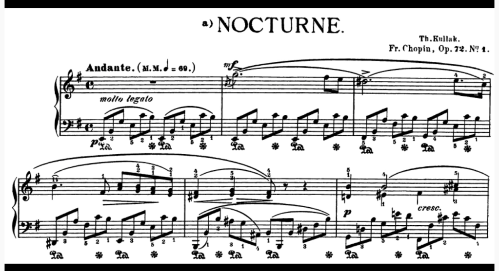 The Nocturns – an early Op. 72 and later Op. 27, both deal with the subject of grief, loss acceptance and ultimately transcendence. When he was 17, the family lost his younger sister, Emelia. We hear a very elegant expression of his grief. His story-telling powers are clearly budding but they have not yet sprouted. In OP 27 C# minor, he struggles with grief then gives a wide ranging story, then a wide array of emotions of acceptance, but to transcend grief he returns to it deeper. Exactly what he does is the music of acceptance and tenderness. In the second Nocturne there is acceptance and blue skies. I invite you to listen to climax then the most brilliant ray of musical sunshine ever composed for the piano. See if you can not only hear, but see that ray of sunshine.”