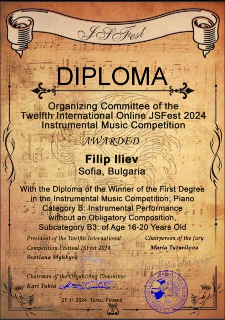 Philip is a student at an immersive musical arts school in Sofia where academics blend with his art. “Truth be told, I prefer the music,” he shared. His school, National Music School, Lyubomir Pipkov , believes that “Music Comes First.” He currently stuies with Professor Alexander Vassilenko. In addition to academics and his school Philip takes masterclasses at almost every opportunity. In addition to his school, his motivation and curiosity has taken him on three occasions to Salzburg, Austria, where he attended the Mozarteum University, ClavoCologne Master Class, then returned to follow up classes with a particular professor that he found most inspiring.